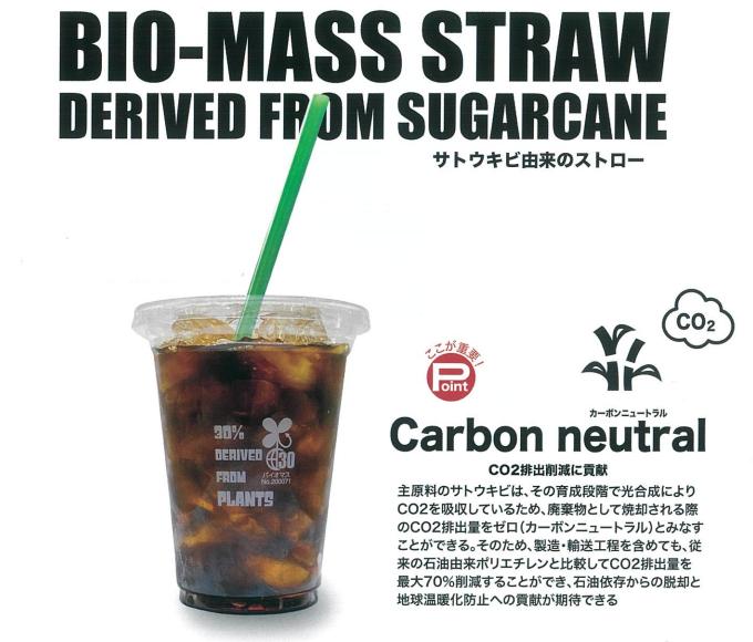 サトウキビ由来のストロー。石油依存からの脱却と地球温暖化防止への貢献が期待できる。