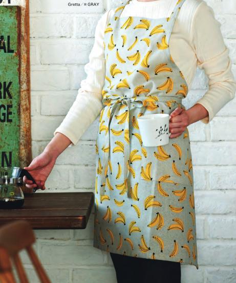 グレッタ エプロン 【PINK・BLUE・GRAY】 遊び心をプラスした食べ物柄。 何着も持っていたくなるデザインです。 バナナ柄。 ■商品の写真は、なるべく実物に近い状態になるよう努力しておりますが、光の具合やパソコンのモニターの種別、環境によっては、見え方が実際のものと多少異なって見える場合もございますので、ご了承ください。 ■在庫数は随時変更を行っていますが、更新のタイミングによって…