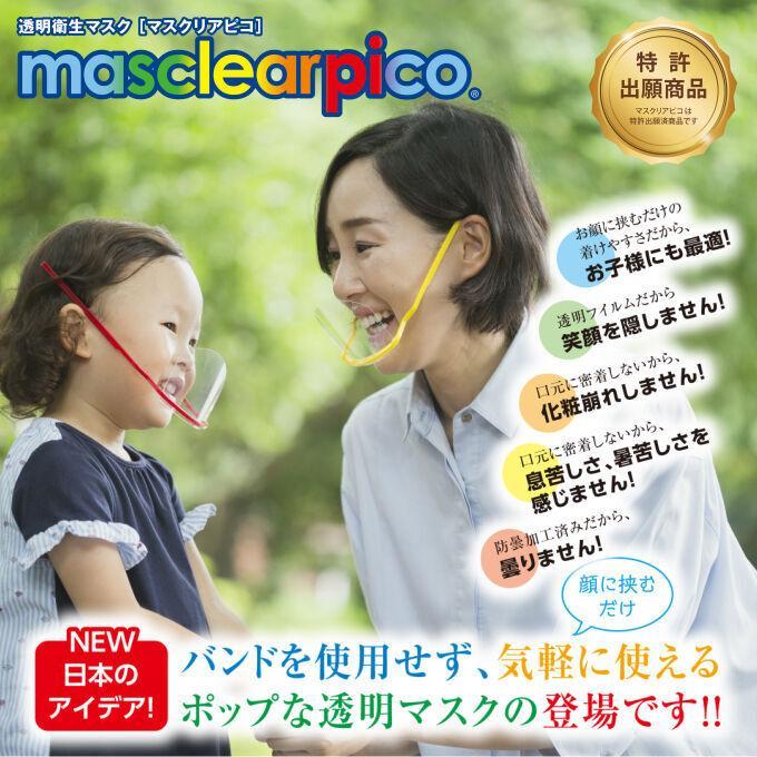 新発売!!! 従来品の長く使えるマスクリアエコノとは別の「使い捨てに近い透明マスクが欲しい」とのお声がきっかけで誕生したマスクリアPICO(ピコ)の登場です! イベントやレジャーでマスクを嫌がるお子様や、勿論大人の方の1日使い切りにも最適な新しいタイプの透明衛生マスクです。 レッド、ブルー、イエロー、グリーン、オレンジの5個入/5色セット(M-PICO-5C)&ホワイト1個入(M-PICO-1W)をラインナップ!…
