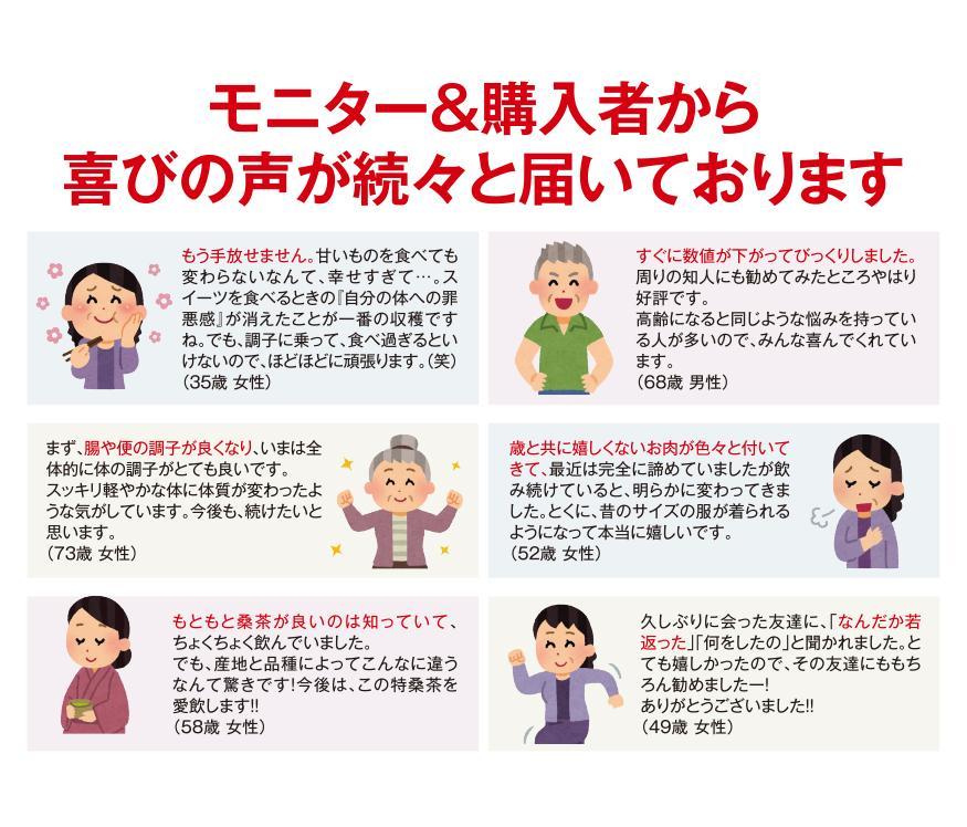 もともと桑茶が良いのは知っていて、ちょくちょく飲んでいました。でも、産地と品種によってこんなに違うなんて驚きです!今後は、桑茶を愛飲します!!