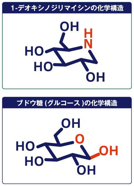 DNJとブドウ糖(グルコース)の構造が非常に似ていることから、体内で糖分分解酵素α-グルコシダーゼという消化酵素が分解する際に、糖ではなく親和性のより高いDNJに先に反応して結合します。DNJが糖の身代わりになるため、糖が分解されなくなり、吸収されないままに排出されます。
