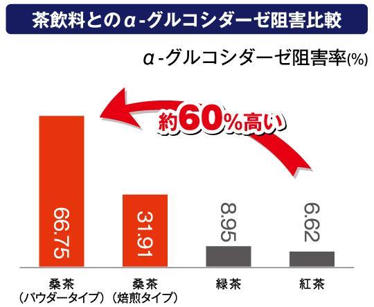 桑茶、緑茶、紅茶という主要茶を比較すると、桑茶がこの消化酵素α-グルコシダーゼ阻害率が圧倒的に高く、桑茶は高血糖値・高血圧・糖尿病などの対策により有効です。