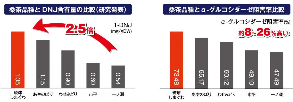 琉球しまぐわは、DNJのみならず、他の桑の葉の各品種と比較して、いろいろな栄養成分が豊富な桑の葉です。不足しがちな多様なミネラル栄養成分が、一度に摂取できる優れた栄養補給食品だとも言えます。