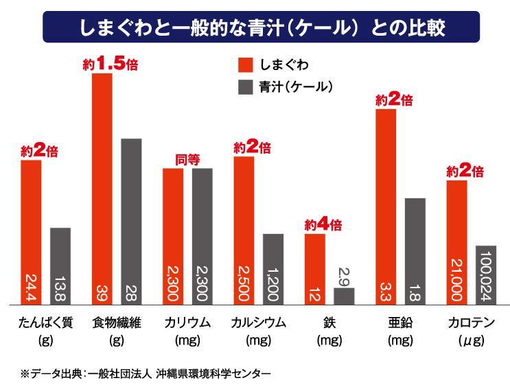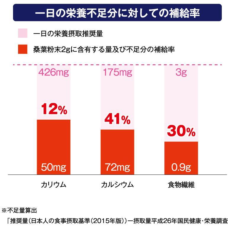 たとえば、カルシウムの一日不足量175mgに対して、「琉球しまぐわ」粉末タイプ2gで、41%(72mg含有)補給。他、ビタミンB1(28%補給)、鉄(7%補給)など、毎日の不足分を手軽に補えます。