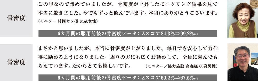 モニター参加して「骨密度が上昇」という嬉しい結果が出た、という話を知人から聞いて、私もモニターに 参加しました。まさかと思いましたが、私も同じように、骨密度で嬉しい結果が出ましたー!(65歳女性)