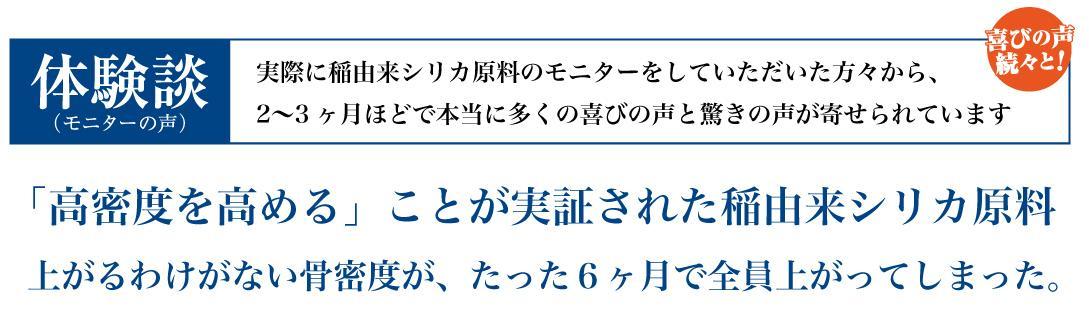 骨密度の数字もそうですが、足腰が若返った気がして、大好きな登山に、頻繁に行ける様になりました。 最近は元気もりもりです。RB1シリカのおかげです。ありがとう!(58歳男性)