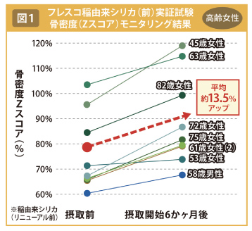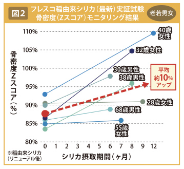 最新の実証試験は、28~68歳の男女7人を対象に実施。1日100ミリグラムを6~12カ月間摂取させたところ、7人全員の骨密度(Zスコア)の上昇が確認された(図2)。上昇率は平均約10%だった。前回の試験よりも、幅広い年齢層・性別を対象にした試験で、有効性が期待できることが示唆された。