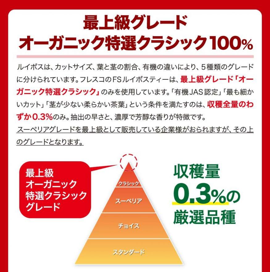 カットサイズ、葉と茎の割合、有機の違いにより、5種類のグレードに分けられ、上位から、クラシック、スーペリア、チョイス、スタンダードとあります。スーペリアを最上級として販売をしている企業様がいる中、ORT-RC1は、その上の最上級グレード「クラシックオーガニック」のみを使用しています。