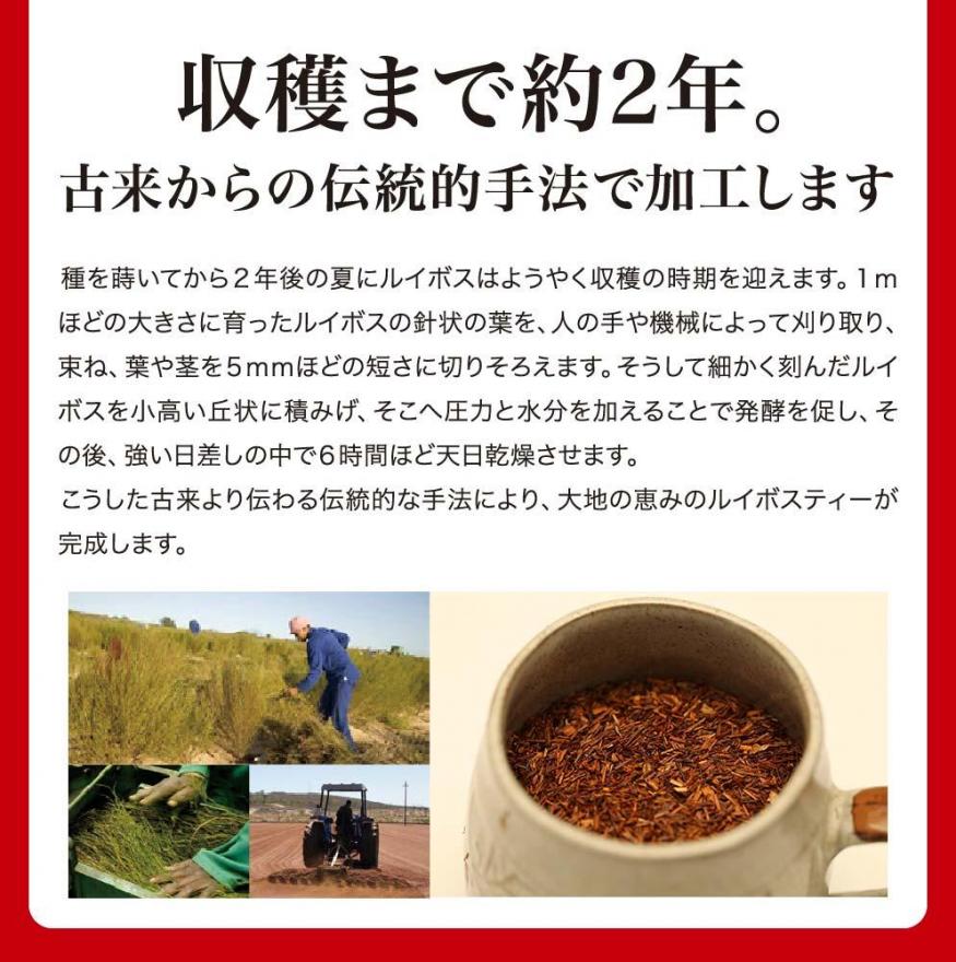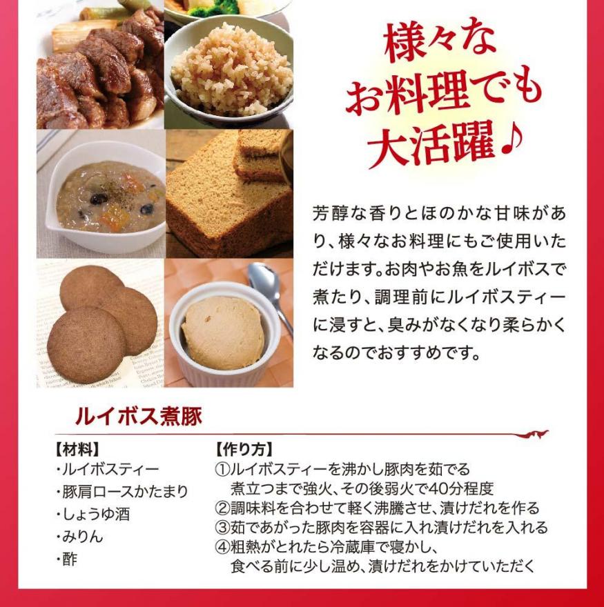 芳醇な香りとほのかな甘味があり、様々なお料理にもご使用いただけます。お肉屋お魚をルイボスで煮たり、調理前にルイボスティーに浸すと、臭みがなくなり柔らかくなります。