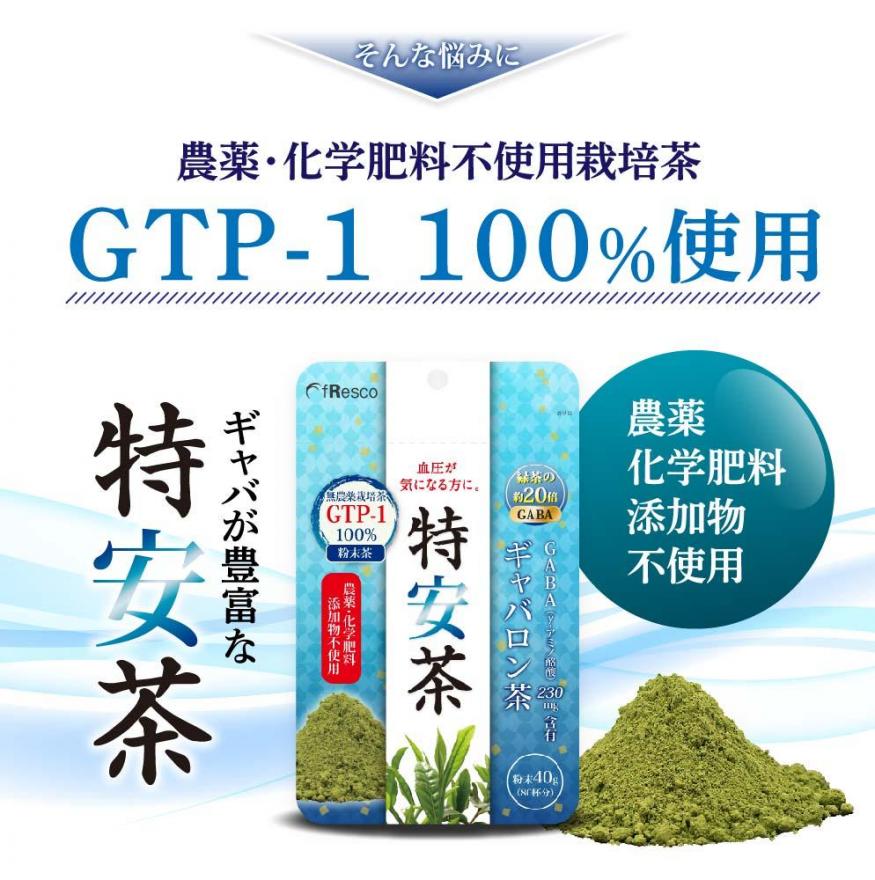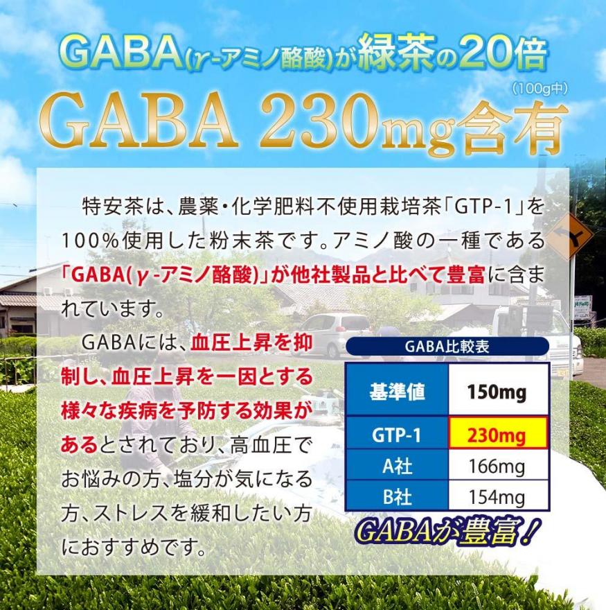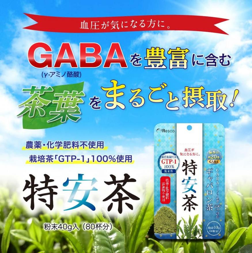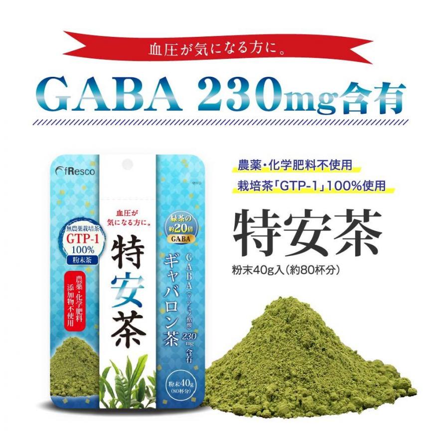 特安茶は、アミノ酸の一種である「GABA(γ-アミノ酪酸)」が他社製品と比べて豊富に含まれた無農薬栽培茶です。GABAは、血圧上昇を抑制し、血圧上昇を一因とする様々な疾病を予防する効果があるとされおり、また、本来緑茶が持つカテキン、フラボノール、ビタミンCなどの有効成分も多く含まれています。高血圧でお悩みの方、ストレスを緩和したい方におすすめの健康茶です。