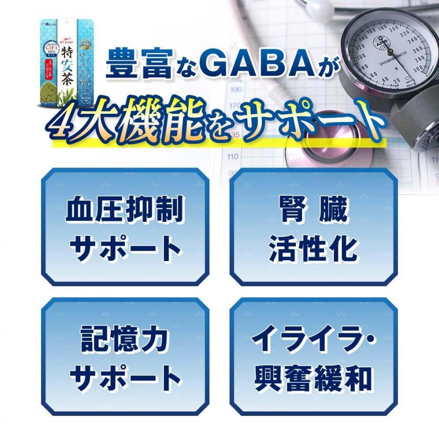 特安茶は、GABAを豊富に含み、高血圧の対策や抗ストレス効果が期待されます。本来緑茶が持つカテキンやフラボノール、ビタミンCなどの有効成分も多く含まれています。塩分を控えている方や糖分を気にしている方、ストレスを気にしている方などにおすすめの商品になります。