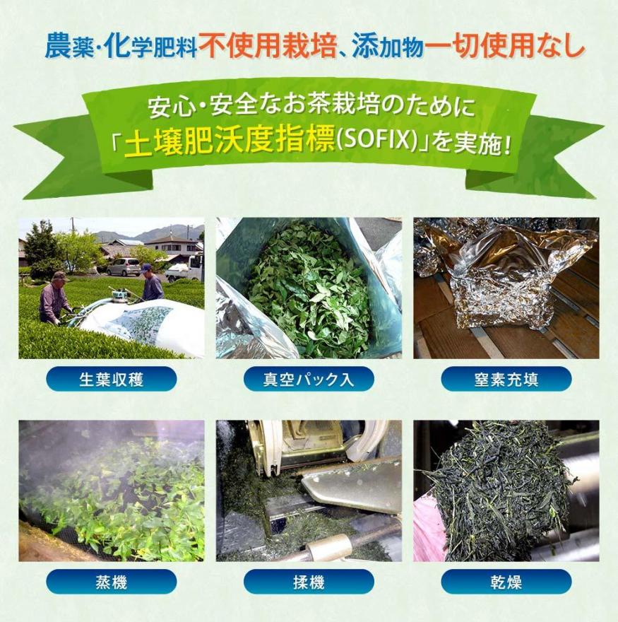 特安茶は、普通は刈り落とされてしまう事の多い「二番茶・三番茶」を有効活用する方法として生まれました。生の茶葉を窒素ガスの中に入れて保存することで、GABAを豊富に含み、独特の香りを持つ緑茶ができ上がりました。農薬・化学肥料不使用栽培で、また添加物も一切使用していない安心安全なお茶です。