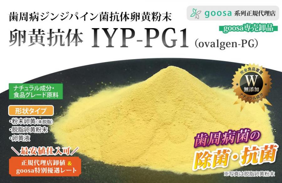 IYP-PG1は、歯周病の原因となるジンジバリス菌の酵素(ジンジバイン)に対する抗体を含んだ卵黄素材です。病原性の高いジンジバインを抑制して菌を減らし、歯周病の症状を改善します。こちらの原料は卵黄脱脂粉末タイプになります。