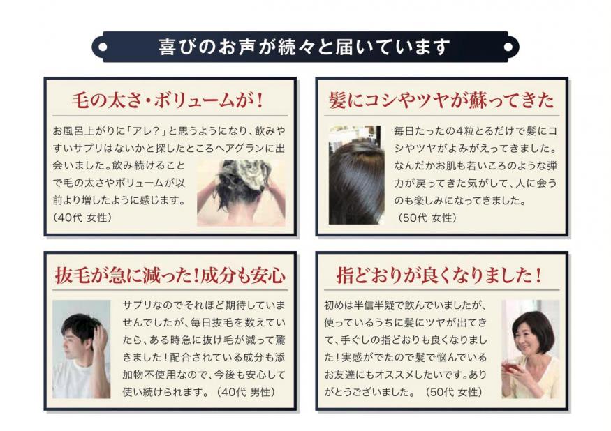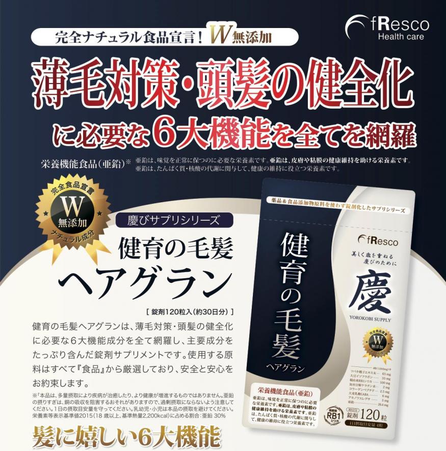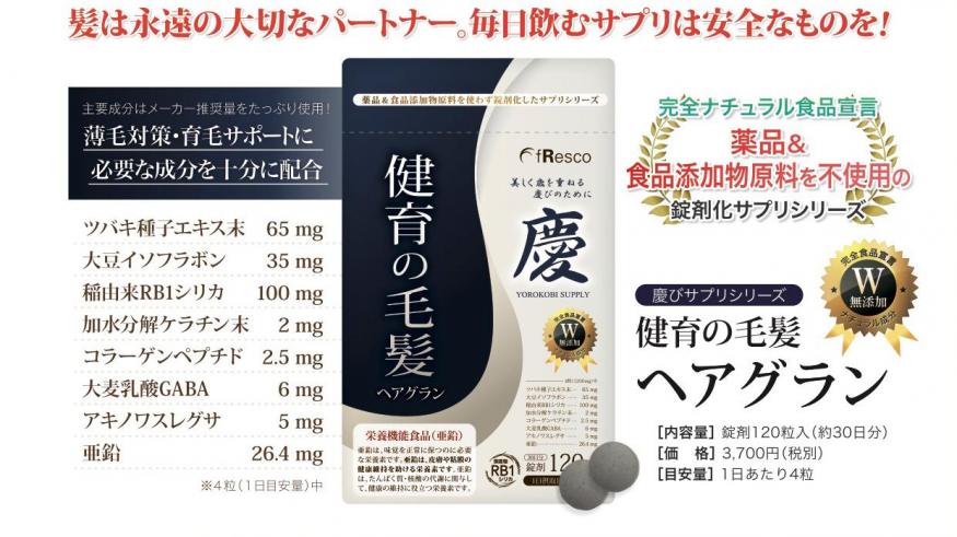 健育の毛髪ヘアグランは、薄毛対策、育毛サポートに必な6大機能成分を全て網羅し、主要成分をたっぷり含んだ錠剤サプリメントです。使用する原料はすべて『食品』から厳選しており、安全と安心をお約束します。