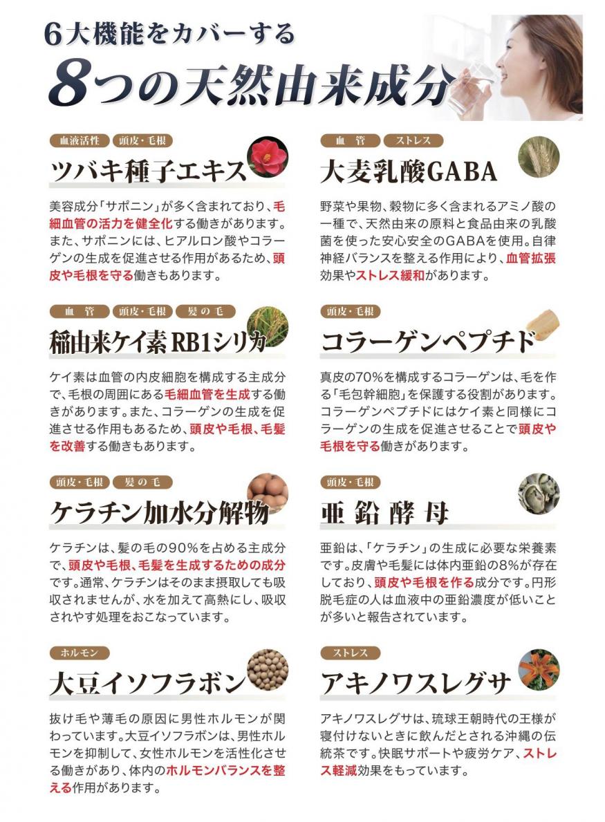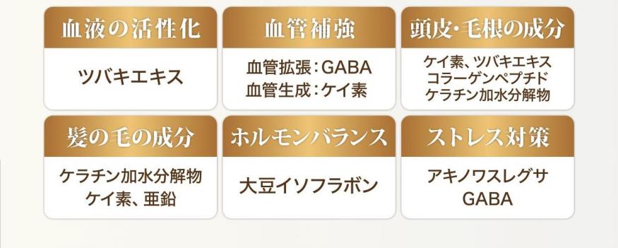 [稲由来ケイ素]・・・ケイ素は血管の内皮細胞を構成する主成分で、毛根の周囲にある毛細血管を増強する働きもあります。また、コラーゲンの生成を促進させる作用もあるため、頭皮や毛根、毛髪を改善する働きもあります。