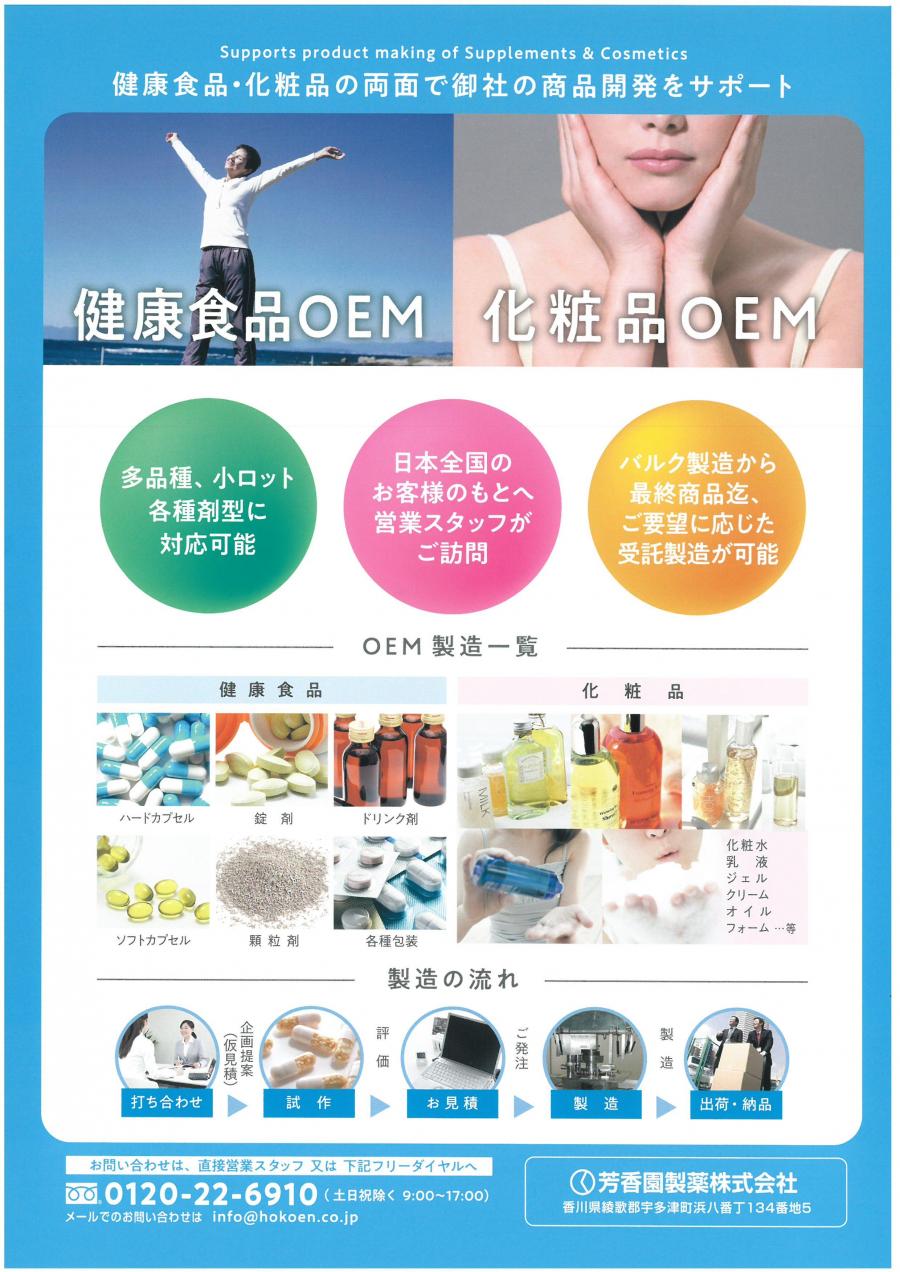 健康食品(サプリメント)の受託製造(OEM)を行っている芳香園製薬株式会社は、健康食品の企画開発・設計を行い、原料の配合から成形・加工、瓶詰め、パッケージングにいたるまで一貫生産体制を整えています。