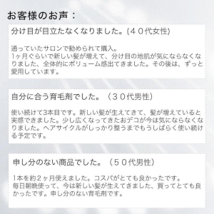 細胞賦活、発毛促進、育毛効果が証明されたエビデンスデータのある原料を使用。効果と実感性と同様に使いやすさにもこだわっており、塗布に便利なノゾル容器採用。約3,000滴、約1ヶ月~2ヶ月使用可能。