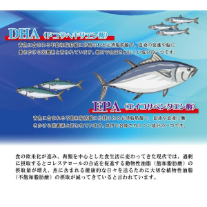 DHAは青魚に含まれる必須脂肪酸でドコサヘキサエン酸とも呼ばれています。不飽和脂肪酸に分類され、常温で固まりにくく、血管を柔らかくして血液の促進や脳に働きかける栄養素といわれています。
