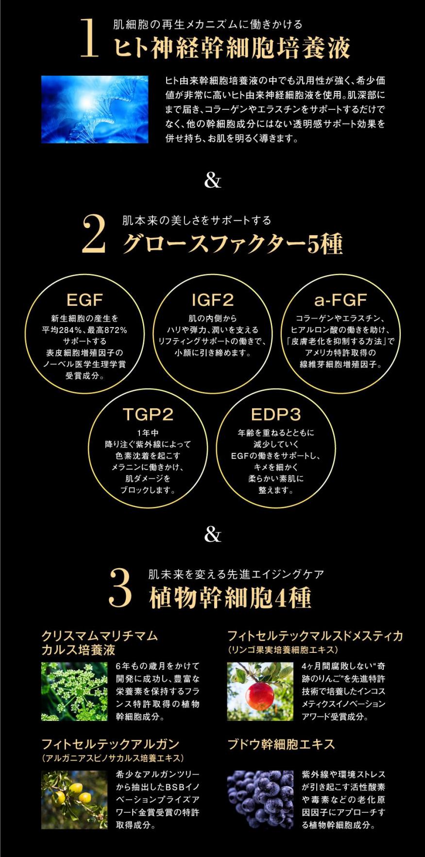 大ヒット商品『リファージュ』を超えた次世代最高級オールインワンクリーム『リヴィアージュ』が誕生。今最も注目の幹細胞の一つ「ヒト由来神経幹細胞培養液」をはじめ、美容業界で常に高い注目を集めるグロースファクターや先端バイオ科学によって生まれた話題の幹細胞など世界中の美容成分を厳選した全50種を高濃縮しました。
