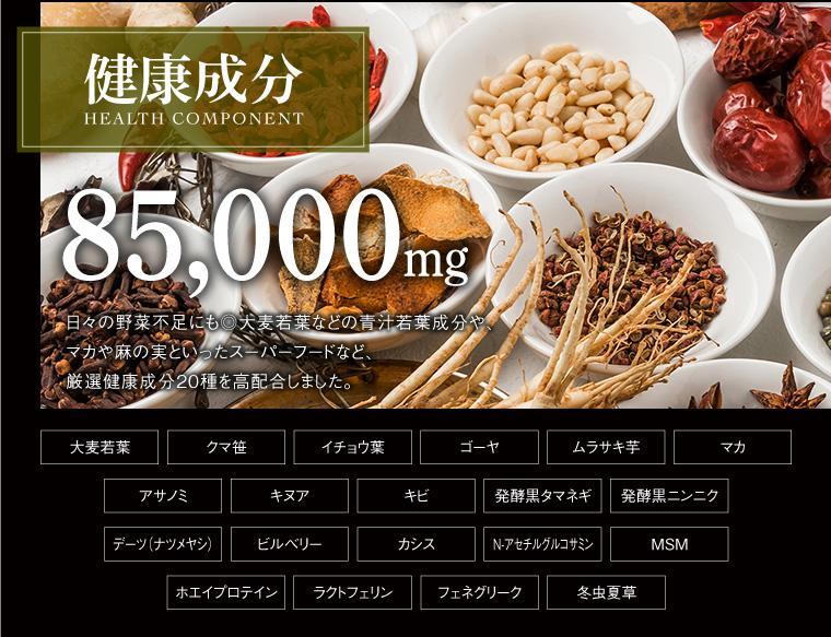 植物発酵エキス(国内製造(糖蜜、黒砂糖、ヨモギ、ウコン、その他))、グレープ濃縮果汁、難消化性デキストリン、黒糖(沖縄産)、マルチトールシラップ、デーツ濃縮果汁、アガベイヌリン、ブラックカラント濃縮果汁、ザクロ濃縮果汁、プラセンタ抽出物(豚由来)、植物発酵エキス(糖類、野菜類、果実類、根菜類、穀類、海藻類、ナッツ類、キノコ類、その他)、羊膜エキス末、サイタイエキス、発酵熟成プラセンタエキス末(プラセンタエキス、黒糖、酒酵母)、酵母ペプチド、エラスチン(魚由来)、赤ワインエキス末、ザクロ抽出物、水溶性珪素溶液、植物発酵末(デキストリン、果実・野菜類、穀物類、野草エキス、糖類、海藻類)、食用酵母(マンガン、亜鉛、銅、ヨウ素、モリブテン、クロム、セレン含有)、植物発酵エキス(デキストリン、甜菜糖、黒砂糖、麦芽糖、ヨモギ、ウコン、ドクダミ、ハスの葉、高麗人参、その他)、野草発酵エキス末(デキストリン、てんさい糖、黒砂糖、麦芽糖、よもぎ、その他)、植物発酵エキス(デキストリン、てんさい糖、黒砂糖、麦芽糖、よもぎ、ウコン、ドクダミ、その他)、植物発酵エキスパウダー、穀物麹(大麦、あわ、ひえ、きび、たかきび、紫黒米、米粉)、ビフィズス菌末(バレイショデンプン、ビフィズス菌)、乳果オリゴ糖、酵母発酵米、ドラゴンフルーツ(ピタヤ)、野菜ミックスパウダー(大麦若葉、ケール、ブロッコリー、カボチャ、チンゲン菜、パセリ、人参、セロリ、ゴーヤ、ほうれん草、桑の葉、モロヘイヤ、よもぎ、トマト)、植物混合末(ハブ茶、タイム、その他)、春ウコン、アセロラ果汁末、温州みかん、チオクト酸、システインペプチド含有酵母エキス、フィッシュコラーゲンペプチド、モリンガ末、ボスウェリアエキス、マカ末、乳清たんぱく質、ワイルドヤム乾燥エキス、ノコギリヤシ種子エキス、スパイスミックス(黒コショウ、クローブ、その他)、メチルサルフォニルメタン(MSM)、国産雑穀末、コエンザイムQ10、乳酸菌末(澱粉、生菌乾燥原末)、乳酸菌(デキストリン、還元澱粉糖化物、乳酸菌(殺菌))、有胞子性乳酸菌、クコの実末、L-オルニチン塩酸塩、L-シトルリン、ヒハツエキス、玄米麹粉末、穀物発酵エキス、マルトデキストリン、乳酸菌(乳酸菌殺菌菌体、デキストリン)、L-カルニチンフマル酸塩、フーディアゴードニー、生コーヒー豆エキス、ツバメの巣エキス、サメ軟骨抽出物、シルクペプチド、サケ卵巣外皮エキス、冬虫夏草菌糸体、高麗人参、乾燥ローヤルゼリー、ビルベリーエキス、カシスエキス、N-アセチルグルコサミン、紅景天、黒酢もろみ、ニンニク、タマネギ、トウモロコシ抽出物(セラミド含有)/ 酸味料、香料、増粘剤(キサンタンガム)、甘味料(スクラロース、アセスルファムカリウム、ネオテーム)、緑茶抽出物、V.B1、トレハロース、クエン酸鉄Na、ラクトフェリン、コンニャクイモ抽出物、プロポリス抽出物、硫酸Mg、L-リジン、L-アルギニン、L-グルタミン、L-プロリン、L-メチオニン、L-トリプトファン、L-ヒスチジン、L-トレオニン、L-フェニルアラニン、グリシン、L-チロシン、香辛料抽出物、キトサン、塩化K、L-バリン、L-ロイシン、L-イソロイシン、V.C、V.E、ナイアシン、パントテン酸Ca、V.B2、V.B6、V.A、葉酸、活性炭、V.D、V.B12、(一部に乳成分・大豆・えび・かに・豚・りんご・オレンジ・もも・キウイフルーツ・バナナ・やまいも・落花生・カシューナッツ・ゼラチン・さけを含む)