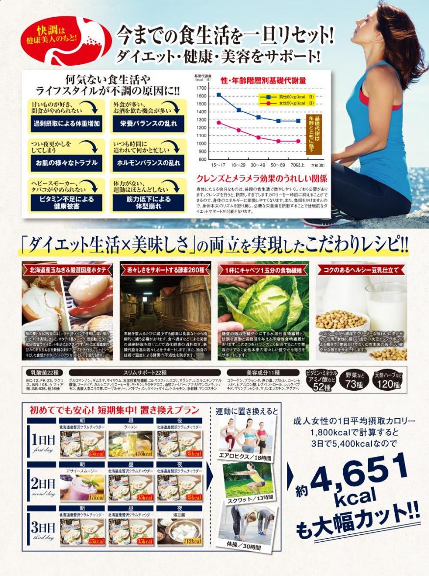 水溶性食物繊維、澱粉、チキンパウダ-、アサリエキスパウダー、グラーニュー糖、食塩、全脂粉乳、乾燥ポテト、粉末油脂、ホタテエキスパウダー、豆乳パウダー、乾燥タマネギ、オニオンパウダー、乾燥パセリ、植物発酵エキス末(黒糖、葉菜類、果実類、根菜類、イモ類、野草類、キノコ類、海藻類、など)、複合ハーブエキス末(アーティチョーク、アイブライト、アグリモニーなど)、明日葉末、ボタンボウフウ末、青シソ末、抹茶末、熊笹末、キダチアロエ末、酒粕ファイバー、アフリカマンゴノキエキス末、シナモン末、マンゴー果汁末、レモン果汁末、黄マカ末、春ウコン末、ボイセンベリーエキス末、リンゴンベリーエキス末、パプリカ末、梅肉末、バラ花びら抽出物、ソフォンエキス末、カシスエキス末、アセロラエキス末、ドラゴンフルーツエキス末、ウチワサボテン果汁末、プルーン末、レッドビート末、モモ果汁末、プエラリアミリフィカ末、白インゲンエキス末、マッシュルームエキス末、タケノコ繊維末、シジミ末、黒生姜末、発酵黒ニンニクエキス末、黒酢末、黒胡椒末、L-シトルリン、フィッシュコラーゲンペプチド、燕の巣末、フカヒレ抽出物、コーンセラミドエキス末、赤ワイン抽出物、シルクペプチド、鮭卵巣膜抽出物、マリンエラスチンエキス末、高麗人参末、ローヤルゼリーFD末、冬虫夏草末、クロレラ、水素吸蔵サンゴ末、ガラナエキス末、エゾウコギエキス末、タマネギ外皮エキス末、グルコマンナン、サイリウムハスク末、コレウスフォルスコリエキス末、サラシアエキス末、L-カルニチンフマル酸塩、ギムネマ末、ガラクトオリゴ糖、ガルシニア末、生コーヒー豆エキス末、フルーツ・野菜エキス(ぶどう、トマト、ニンジン、その他)、ベリー混合エキス末(ワイルドブルーベリー、ストロベリー、クランベリー、ワイルドビルベリー、エルダーベリー、ラズベリー)、黒五粉末(黒ゴマ、黒米、黒大豆、黒松の実、黒カリン)、野菜混合末(大麦若葉、ケール、ブロッコリー、カボチャ、チンゲン菜、パセリ、その他)、パン酵母(亜鉛、マンガン、銅、ヨウ素、セレン、クロム、モリブデン含有)、乳酸菌生産物質(大豆、乳酸菌)、フラクトオリゴ糖、イソマルトオリゴ糖、ガラクトオリゴ糖、キシロオリゴ糖、乳果オリゴ糖、乳酸菌末(FK-23)、有胞子乳酸菌、ビフィズス菌(BR108)、ケフィア菌末、ビフィズス菌末(BB536)、穀物発酵エキス末、多穀麹(大麦、あわ、ひえ、きび、タカキビ、紫黒米、米粉)、マンゴスチンエキス末、アグアヘエキス末/調味料(アミノ酸等)、カゼインNa、乳化剤、酸化防止剤(V.E)、L-オルニチン塩酸塩、微粒二酸化ケイ素、キトサン(エビ・カニ由来)、L-アルギニン、L-チロシン、L-バリン、L-ロイシン、L-イソロイシン、L-フェニルアラニン、L-グルタミン、L-メチオニン、L-スレオニン、L-シスチン、L-リジン、グリシン、L-トリプトファン、L-プロリン、DL-アラニン、L-ヒスジン、L-テアニン、ラクトフェリン、貝Ca、酸化Mg、ピロリン酸第二鉄、塩化カリウム、V.C、ナイアシン、パントテン酸Ca、V.B1、V.B6、V.B2、V.A、葉酸、V.D、V.B12、(原材料の一部に乳、小麦、エビ、カニ、ごま、大豆、鶏肉、豚肉、バナナ、リンゴ、モモ、キウイフルーツ、オレンジ、山芋、カシューナッツ、含む)