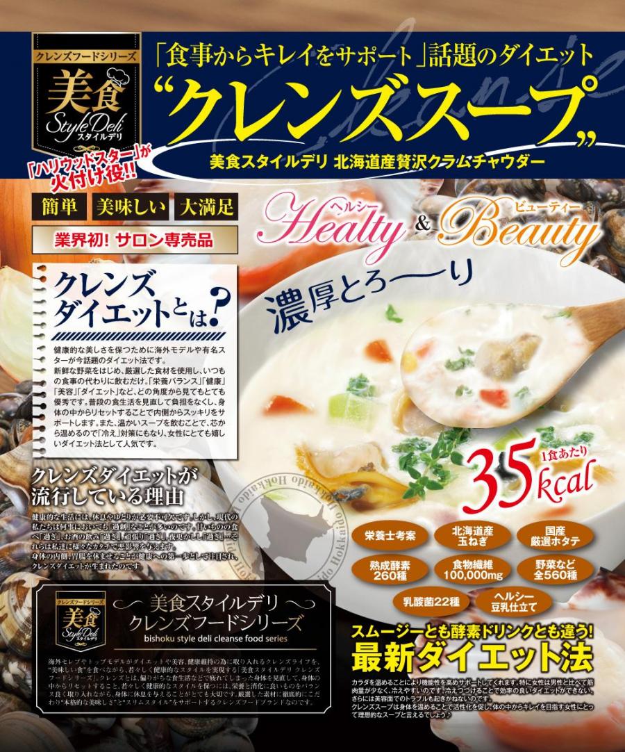 野菜には、72種もの緑黄色野菜をふんだんに使用し、甘味の玉ねぎは北海道産をフリーズドライ化。1食にキャベツ1玉分の食物繊維と魚貝と野菜の旨みが絶妙な濃厚で新鮮なクラムチャウダーに仕上げました。