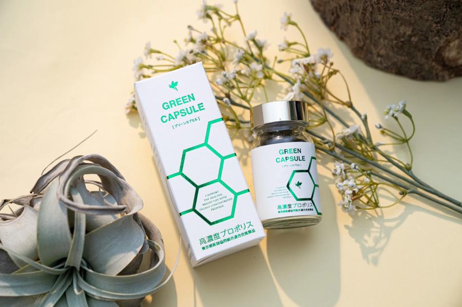 「グリーンカプセル」は、レベルの高いプロポリスを求めている人に応える高品質・高濃度のプロポリスエキスを4倍に濃縮し、カプセルに入れました。