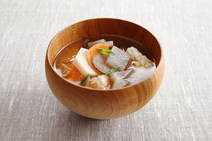 ③鍋にごま油を熱し、香りが出たら1の豆腐を手で割って加え炒める。だしを加え、大根、にんじん、ごぼう、こんにゃく、里芋を加える。煮立ったらアクを取って弱火にして野菜に火を通す。