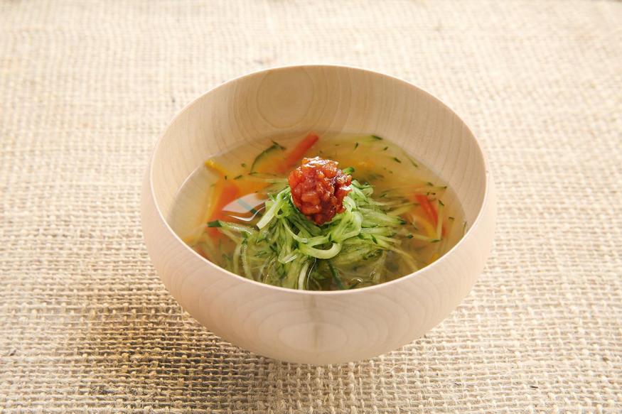 ③椀の中央に1を盛り、2のだし汁をはり、きゅうりの上にしょうゆの実をのせる。