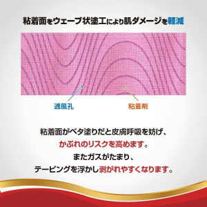 かぶれやすい海外製の粘着剤を使用せず、肌のトラブルが少ない「日本製医療系アクリル粘着剤」を採用。また独自開発による低周波型ウェーブ状塗工により、皮膚呼吸を最大限に確保し、快適な着け心地を持続させます。