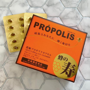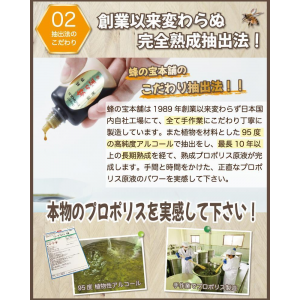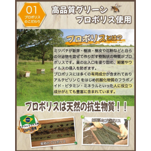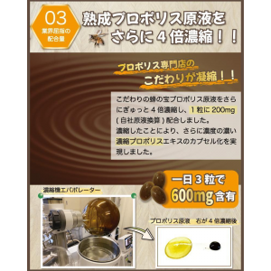 ブラジル・ミナスジェライス州から厳選したグリーンプロポリスの原塊を仕入れ、その原塊を国内自社工場にて手作業でアルコール抽出をし、平均3年熟成された「プロポリス原液」をさらにぎゅっと4倍濃縮したエキスを1粒に200mg(自社原液換算)配合。さらに人が身体の中で作ることのできないオメガ3脂肪酸が豊富に含まれるアマニ油を合わせた栄養機能食品。