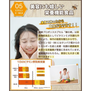 濃縮プロポリスカプセル「蜂の寿」は、栄養機能食品としてビタミンEが抗酸化作用により体内の脂質を酸化から守り、ビタミンB2、B6にはたんぱく質からのエネルギー生産と皮膚・粘膜の健康維持を助ける栄養素が豊富に含まれています。健康維持はもちろん、美容にも大きく期待できます。