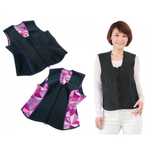 健康増進機器認定を受けた「めぐり美ベスト」(認定番号0001-5)は、常温赤外線を放射するバイオエスペランサ®素材を100%使用し、同社従来品よりも軽量で、着心地良く持ち運びにも便利です。