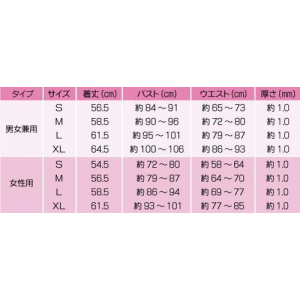 S:着丈54.5,バスト約72-80,ウエスト58-64/M:着丈56.5,バスト約79-87,ウエスト64-70/L:着丈58.5,バスト約86-94,ウエスト69-77/LL:着丈61.5,バスト約93-101,ウエスト77-85/厚さ全て1.0