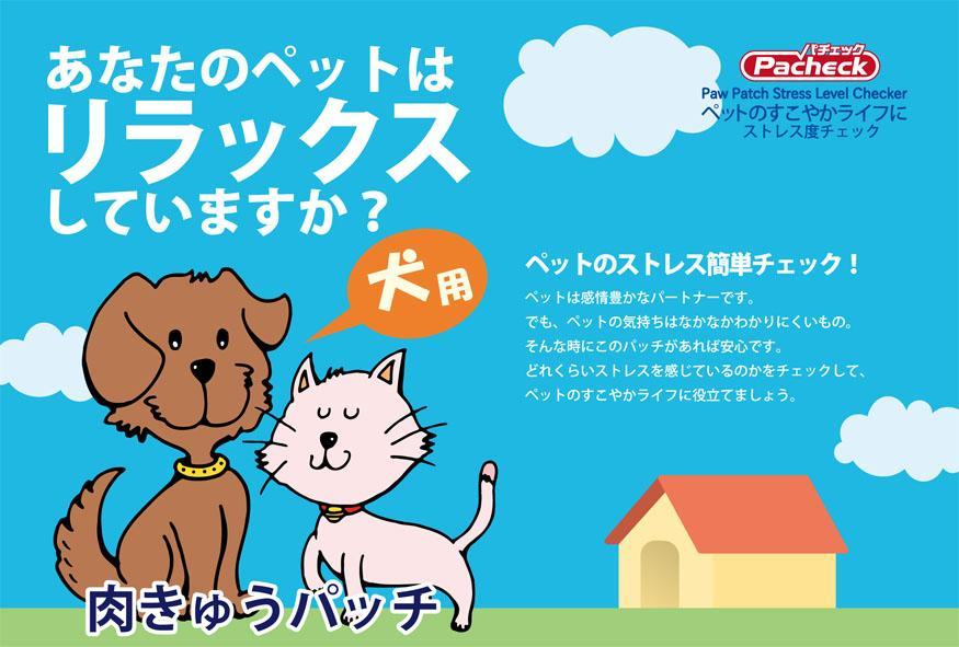 犬の肉球に3分間貼るだけでペットのストレスチェックが出来ます。どのくらいストレスを感じているのかをパッチの色変化で判定して、ペットのすこやかライフに役立てましょう。