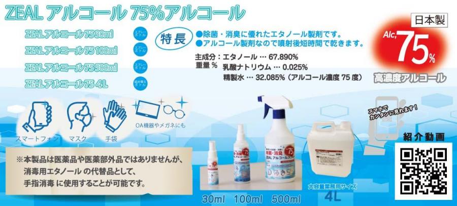 日本製の75%高濃度アルコール 除菌・消臭に優れたエタノール製剤です