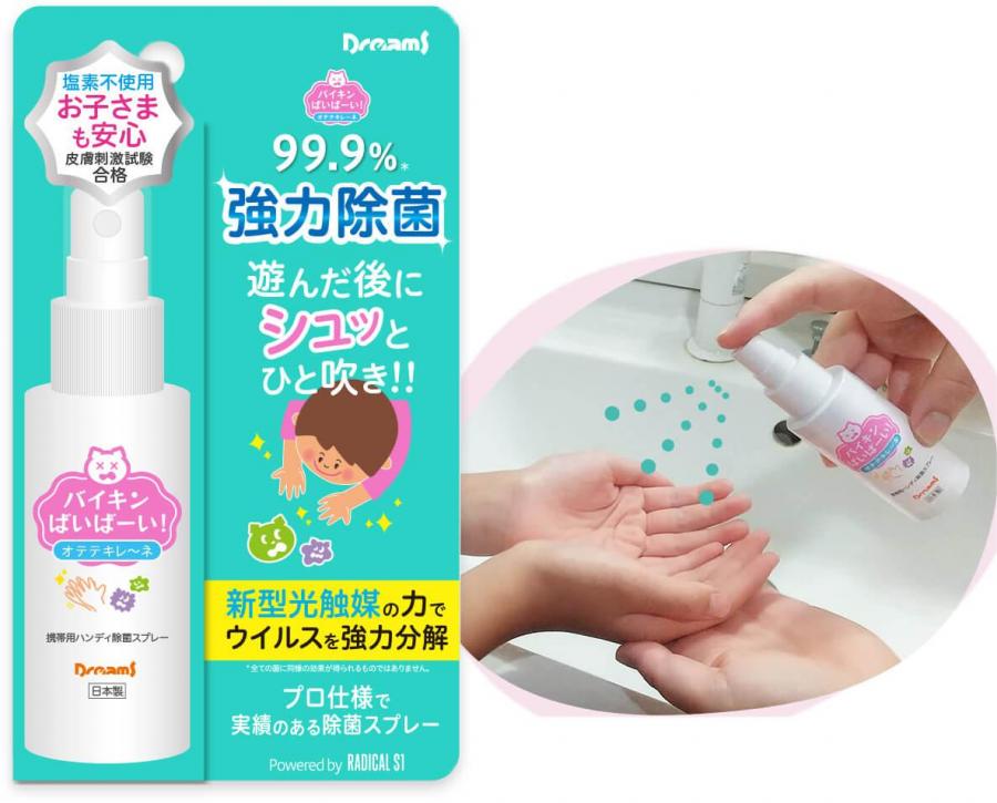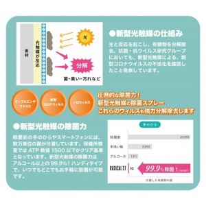 新型光触媒(可視応答形光触媒)を採用した強力除菌スプレー「バイキンばいばーい!オテテキレ~ネ」がインフルエンザの不活化試験に合格しました。噴霧して30分後にはウイルスは検出されず、また24時間後もウイルスの復活はありませんでした。