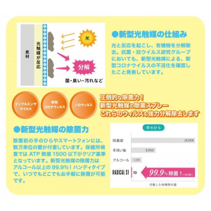 除菌の秘密は新型光触媒。光と反応を起こし、有機物を分解除去します。新型光触媒は微量の光でも反応してウイルス・細菌を強力分解。薄暗い場所や屋内でも十分に効果を発揮します。ノンエンベロープウイルスを含む、アルコールや次亜塩素酸成分の除菌剤で分解できないウイルス・細菌に対しても有効です。