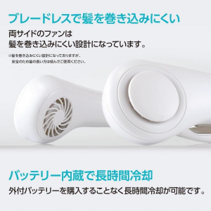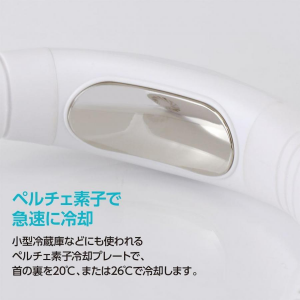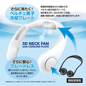 上向きのファンとパソコンのCPU冷却や小型冷蔵庫に使われているペルチェ素子の冷却プレートによって首周りや顔、首の裏などを立体的に冷却できるネックファンが登場。