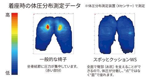 スポッとクッションWSは様々な体格のひとが様々なかっこうで座ったときにフィットするような形状になっていますので着座時の体圧がうまく分散してお尻が痛くなりません。
