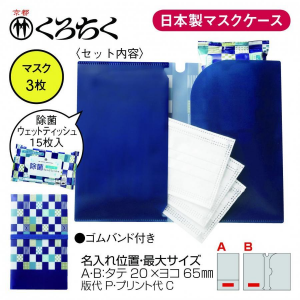 | 備考 | セット内容:ケース×1、マスク×3、除菌ウェットティッシュ×1(15 枚入、シートサイズ:約160×200mm)、ゴムバンド×1 名入れ位置・最大サイズ A・B:タテ20 ×ヨコ65mm 版代P・プリント代C |