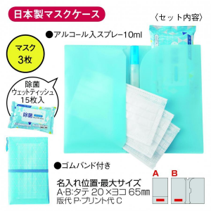 | 備考 | セット内容:ケース×1、アルコール入スプレー×1、マスク×3、除菌ウェットティッシュ×1(15 枚入、シートサイズ:約160×200mm)、ゴムバンド×1 名入れ位置・最大サイズ A・B:タテ20 ×ヨコ65mm 版代P・プリント代C |