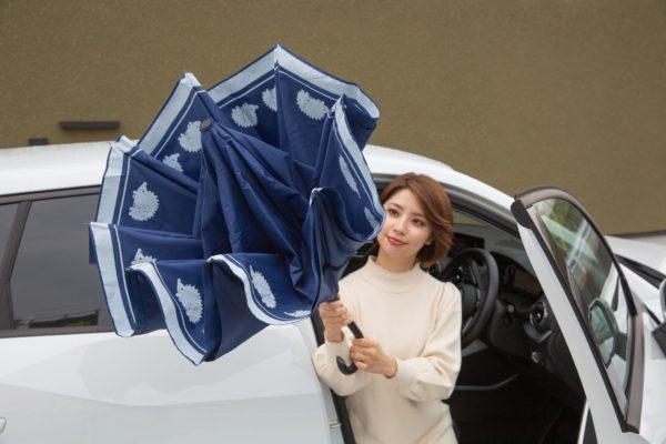 花のつぼみのように逆さに開くので、車の乗り降り時にスムーズに傘の開閉が出来、車の乗り降りで濡れてしまう、車内がビショビショになる「車での傘あるある」問題を解決します。