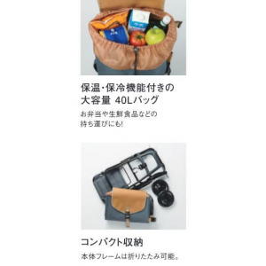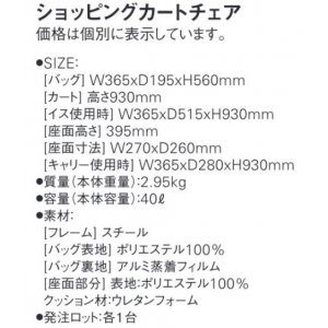 サイズ:【バッグ】W365×D195×H560mm 【カート】高さ930mm 【イス使用時】W365×D515×H930mm 【座面高さ】395mm 【座面寸法】W270×D260mm 【キャリー使用時】W365×D280×H930mm 容量:40ℓ