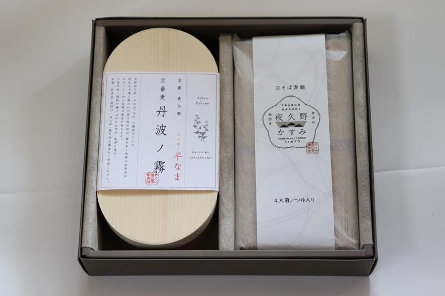 京都府産のそば粉を使った白地の蕎麦「丹波ノ霧」と極細麺「京そば素麺 夜久野かすみ」の2種類の麺をセットにしました。