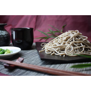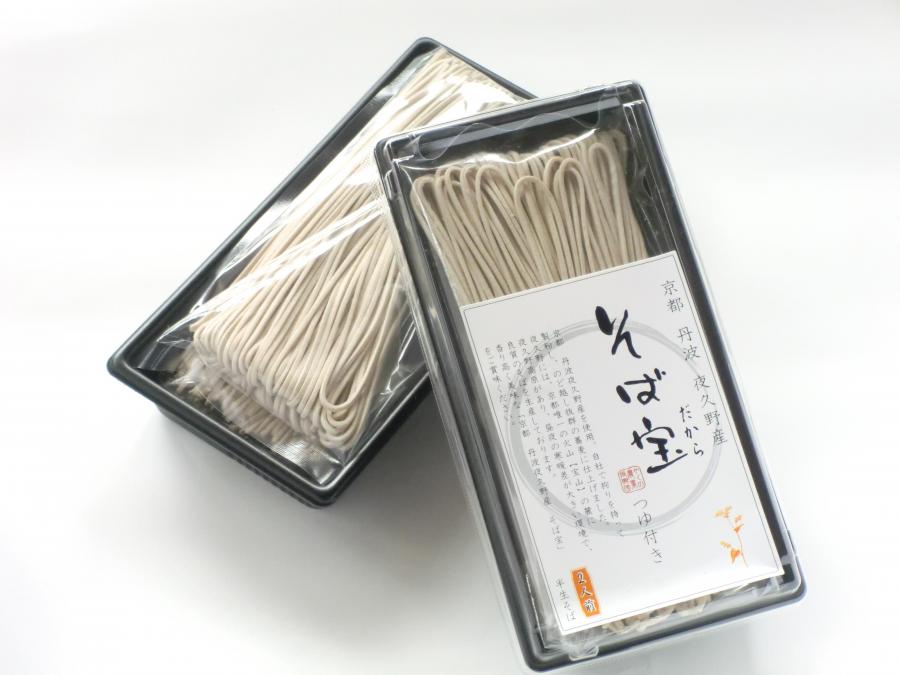 京都府で唯一の火山「宝山」の麓、黒ボク土(火山灰)の肥沃な土壌に覆われた夜久野高原は霧が多く、昼夜の寒暖差が大きいことから良質の蕎麦が育ちます。「そば宝」は、その良質なそばの実を外皮ごと挽いたそば粉「挽きぐるみ粉」をふんだん使用した、力強い味と香りの田舎風そばです。自社にて生産、製粉した農家こだわりの逸品をご賞味ください。