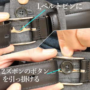 それはベルトピンU字部分にズボンのボタンを引っ掛けることで、ベルトが上・左右にズレなくなります。