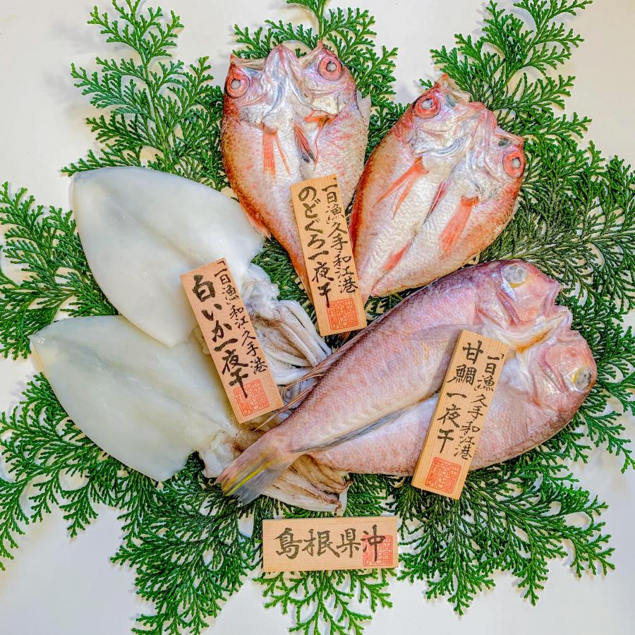 世界遺産「石見銀山」を誇る島根県大田市の特産品ブランド『おおだブランド』に認証された『一日漁』の一夜干【甘鯛】【のどぐろ】【白いか】(するめいかに変更になる場合がございます。)3種を詰合せた豪華なギフト。