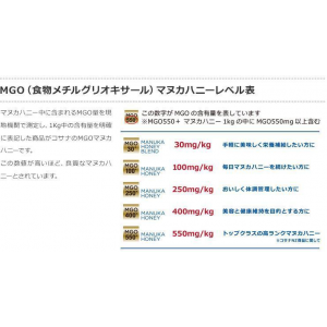 「MGO550+」には、マヌカハニー1kg中に550mg以上のMGOが含まれています。