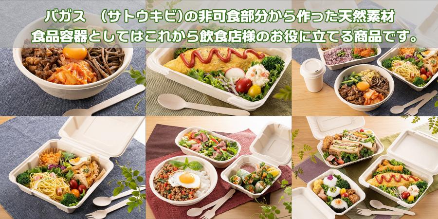 バガス(サトウキビ)の非可食部分から作った天然素材食品容器としてはこれから飲食店様のお役に立てる商品です。